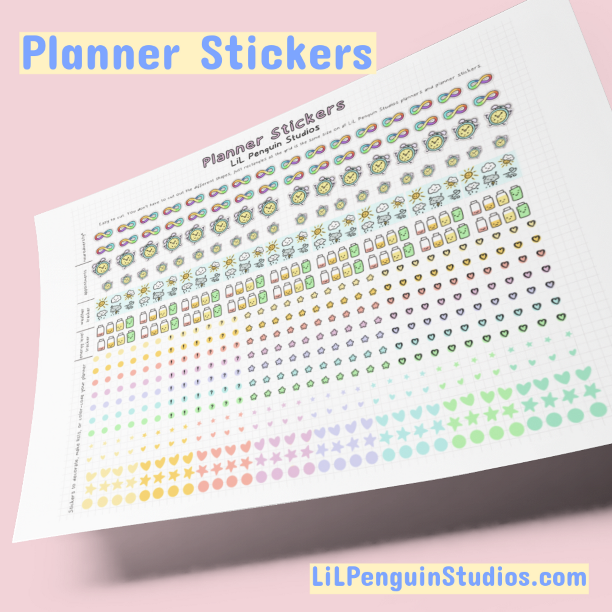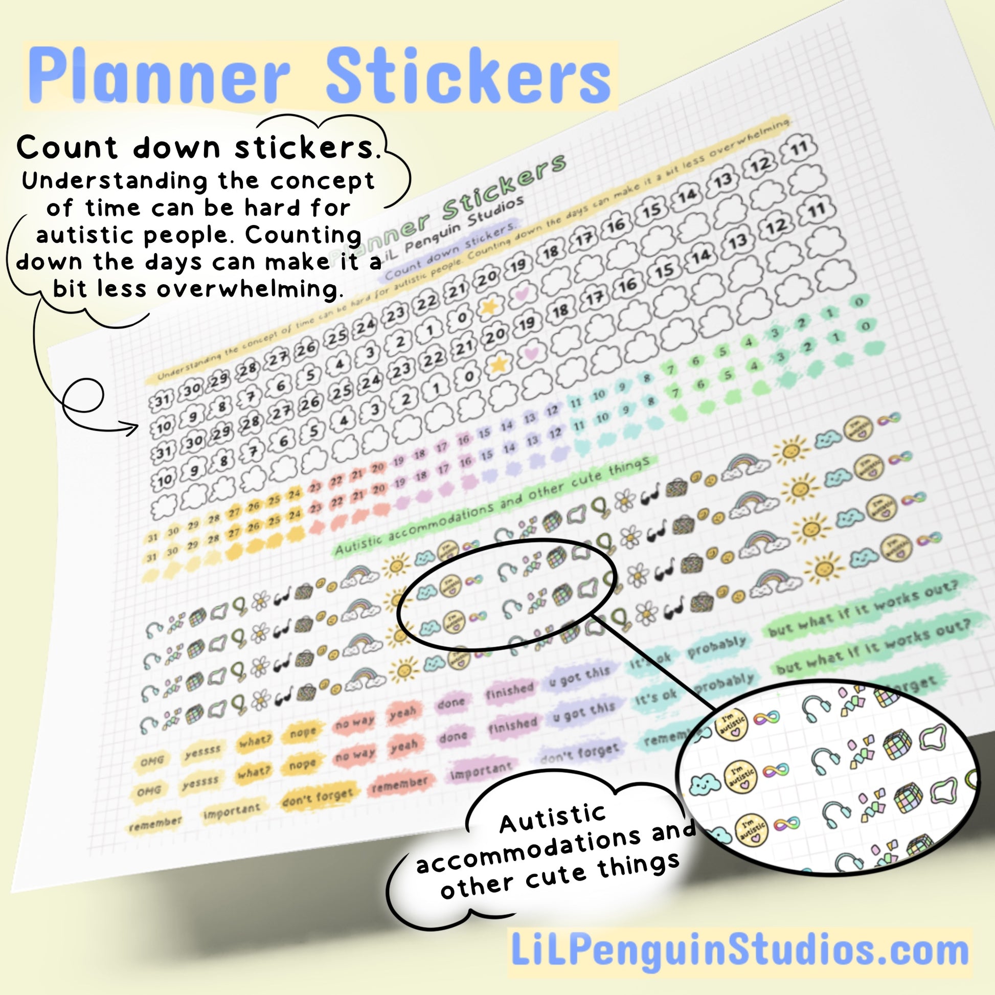 - (themes: autism & neurodiversity, self-care, practical, cute): more than 250 different designs on 6 sheets