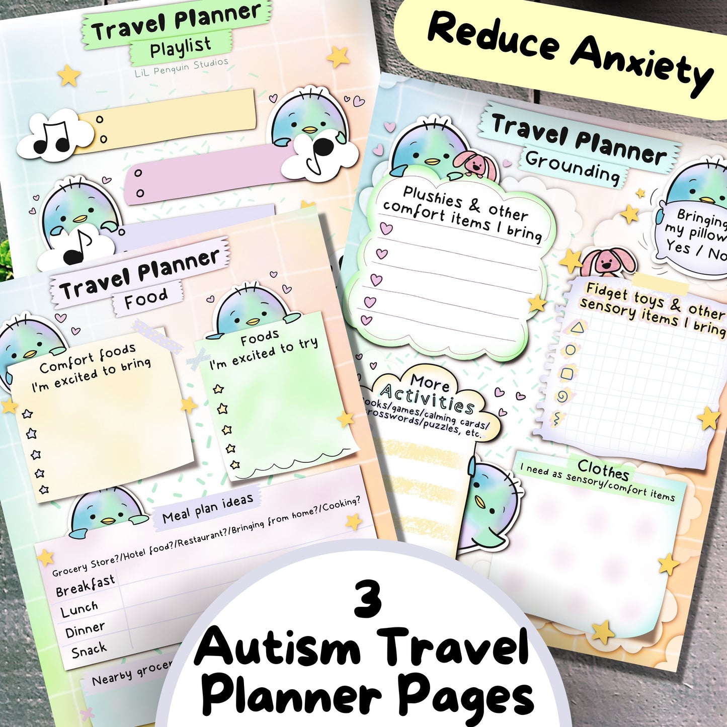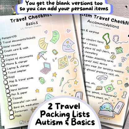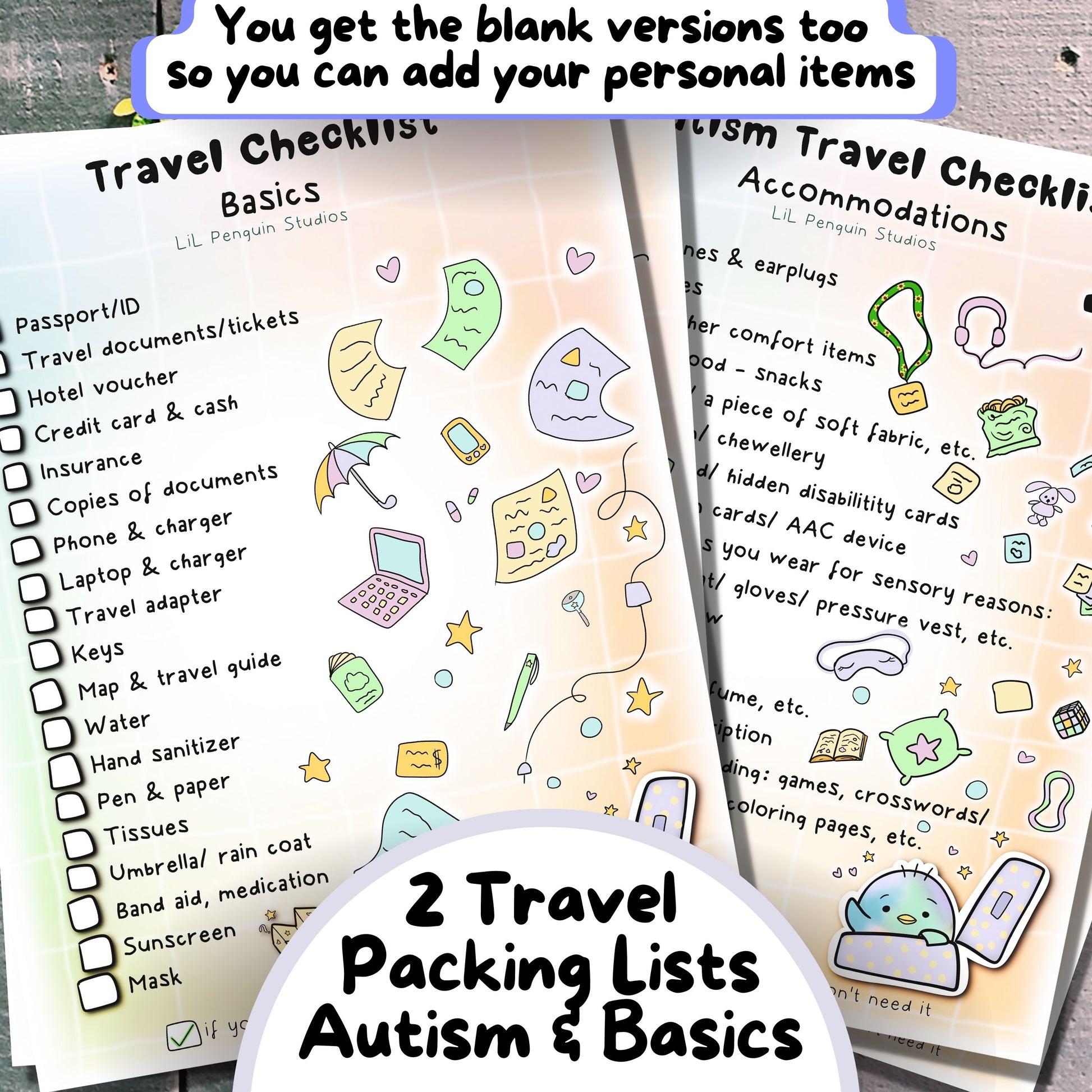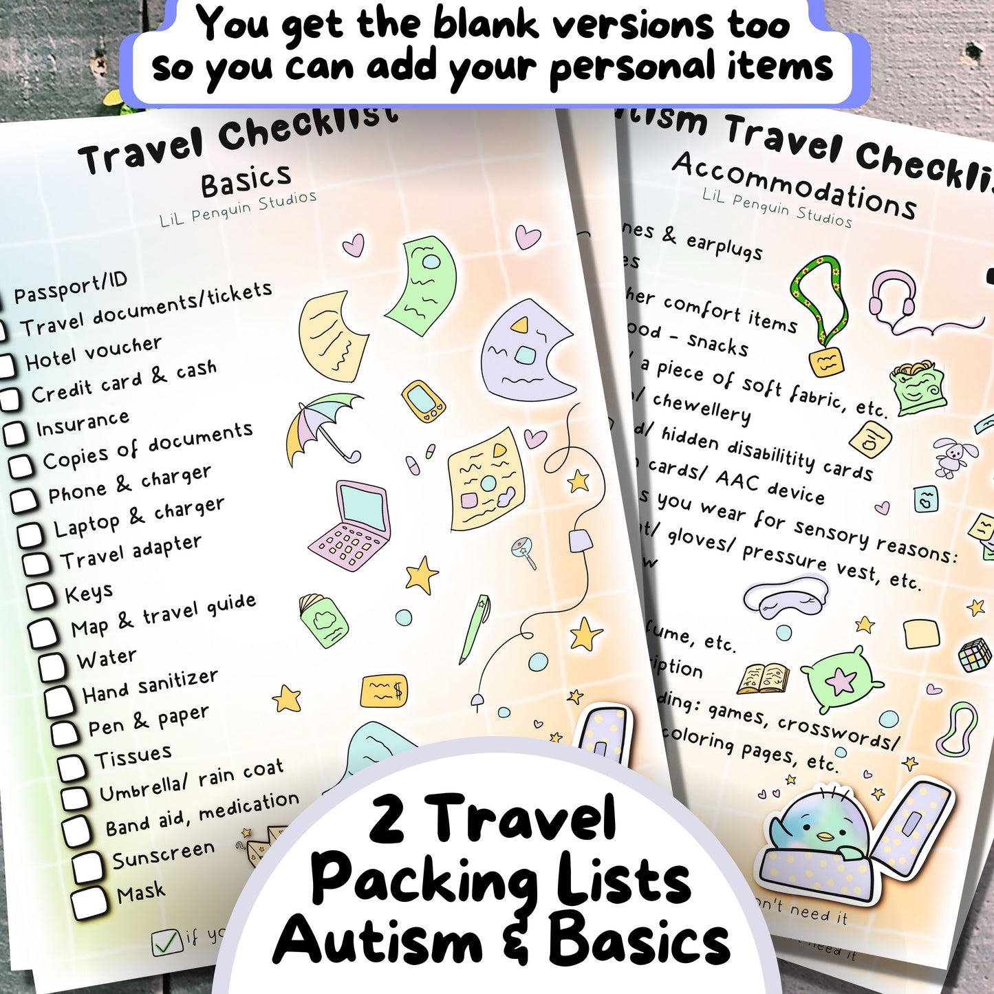 - 2 packing checklist pages: one for autistic accommodations and one for basics