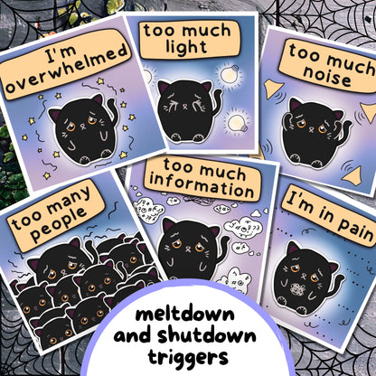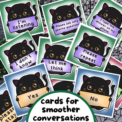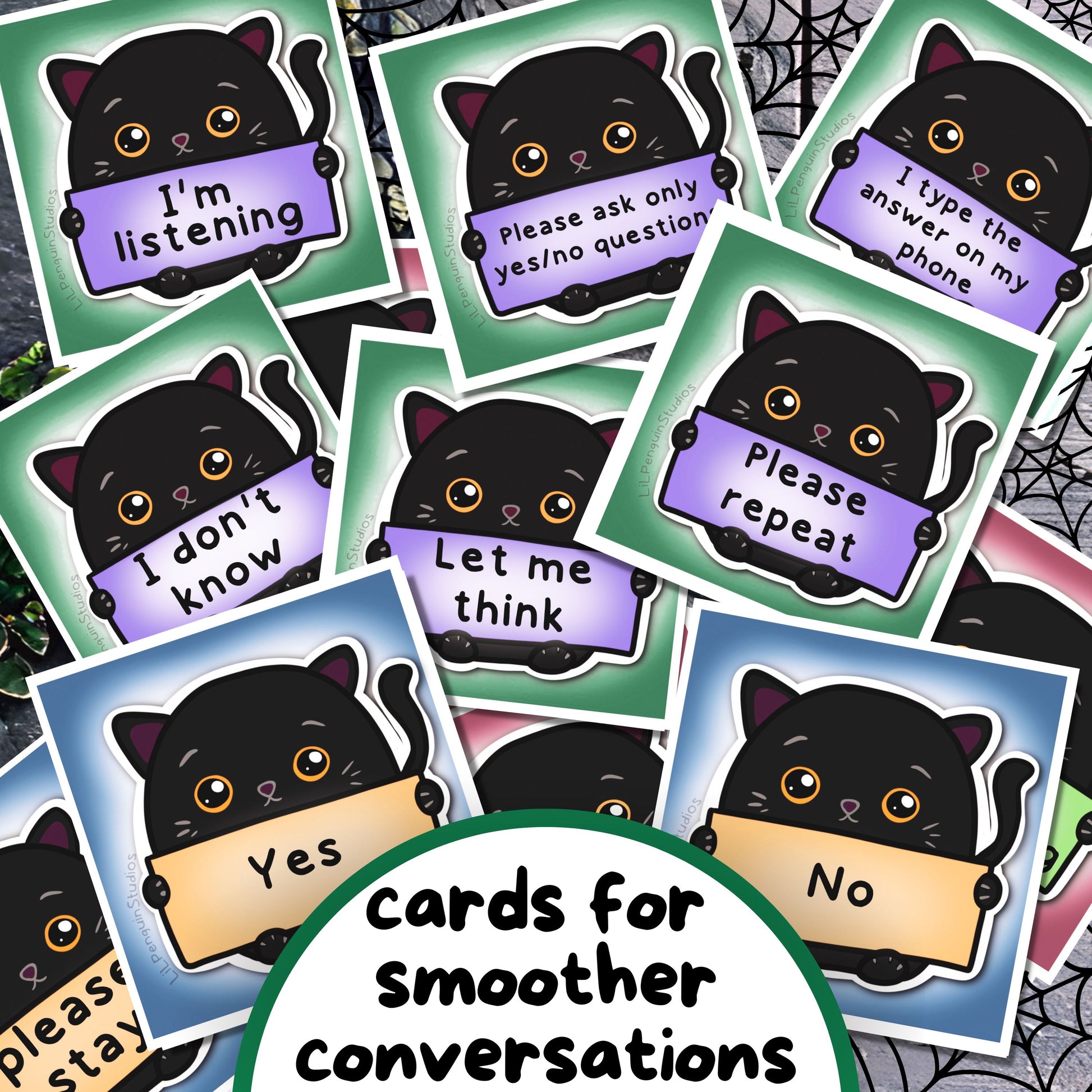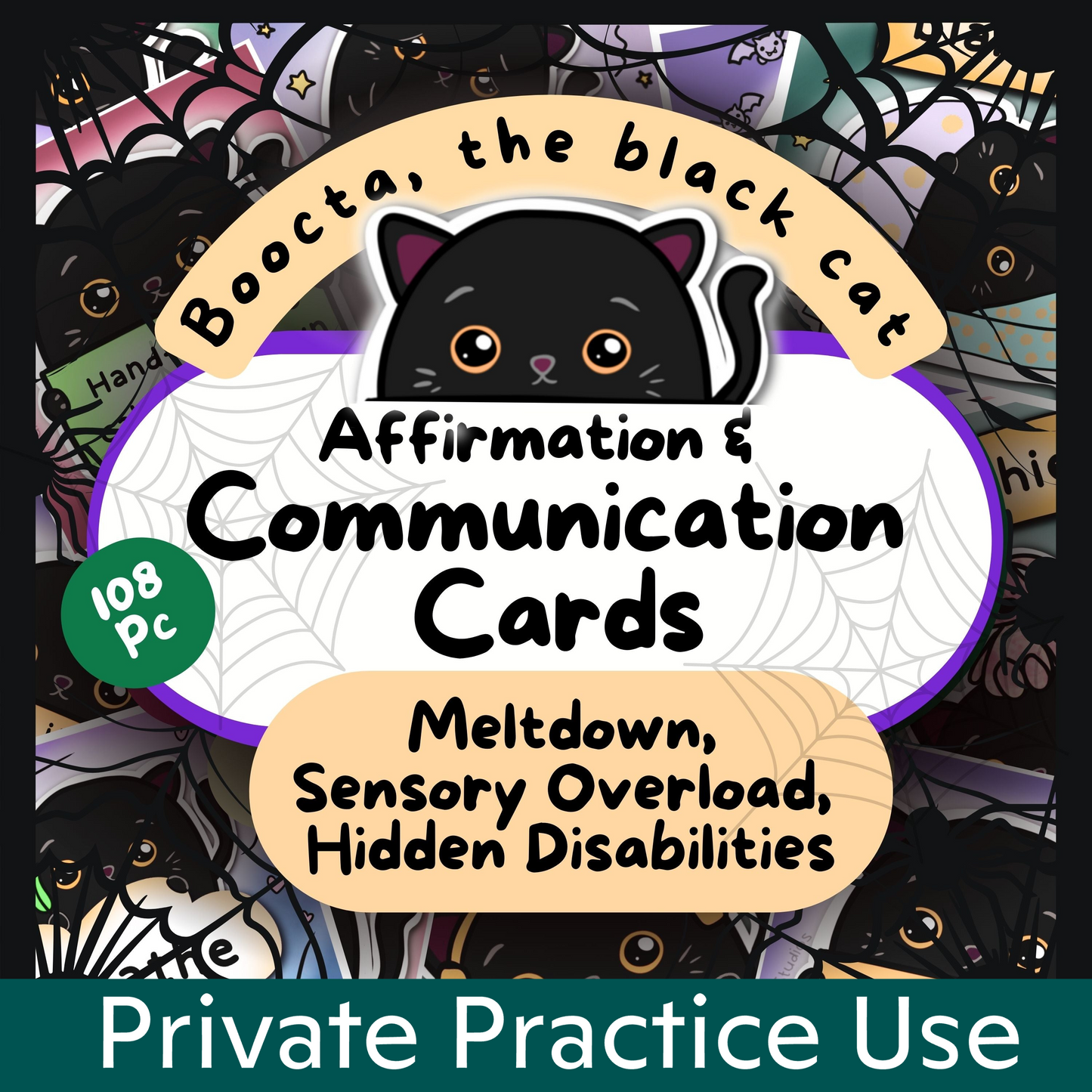 48 filled-in and 48 blank communication cards and 12 affirmation cards in a single bundle ft. Boocta, the black cat.