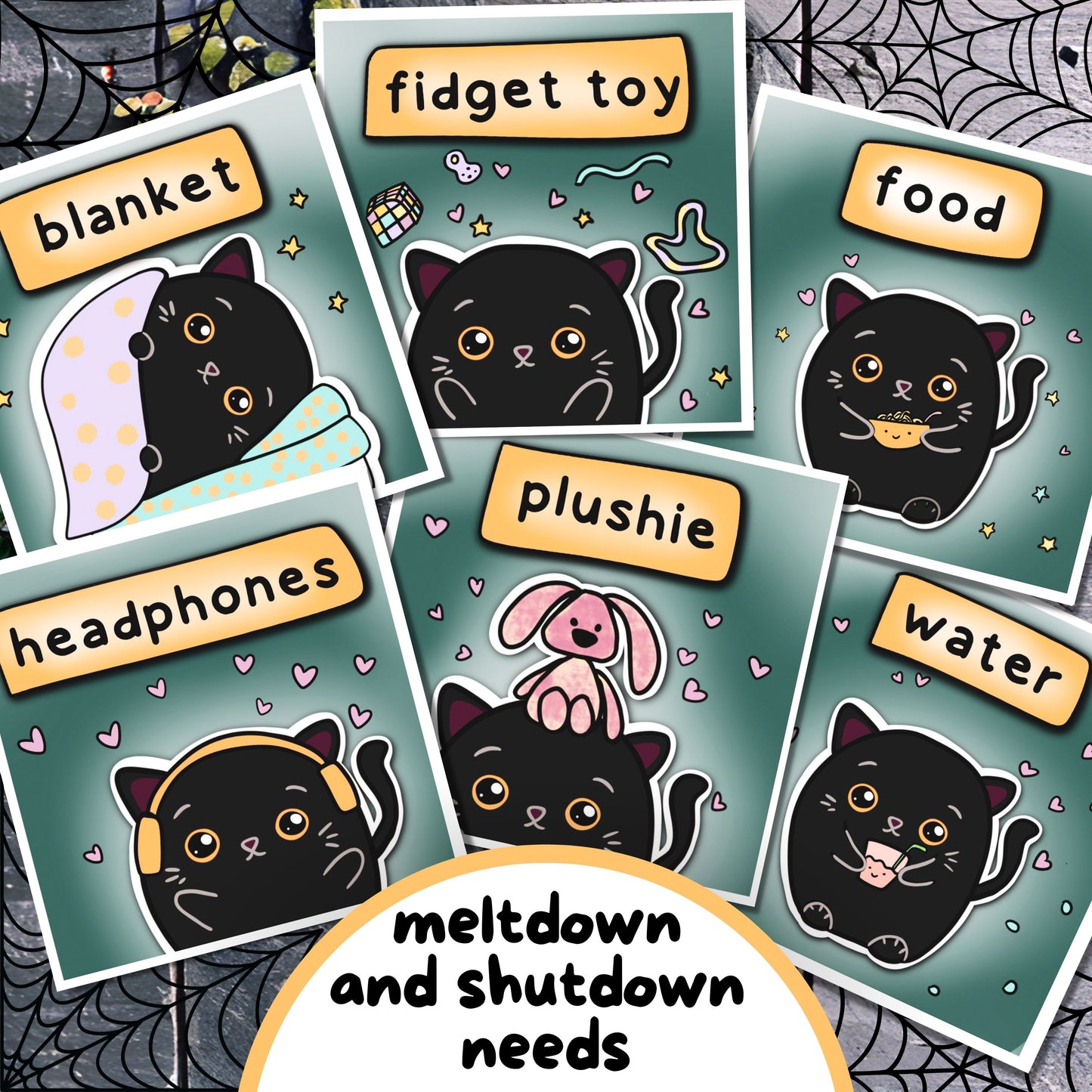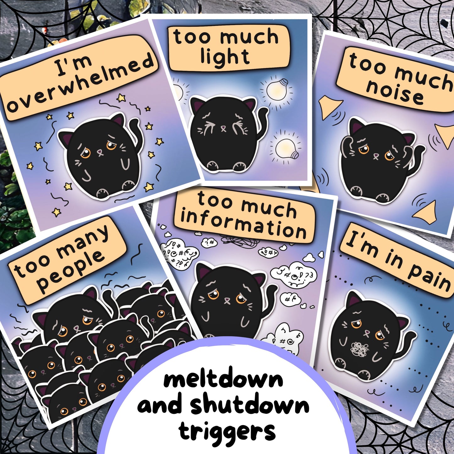 - 2 sheets (= 12 cards)(all cards have different designs and texts). When I made these, I was specifically thinking about some of the most common triggers and needs during meltdowns and shutdowns but of course, you can use them anytime you want.