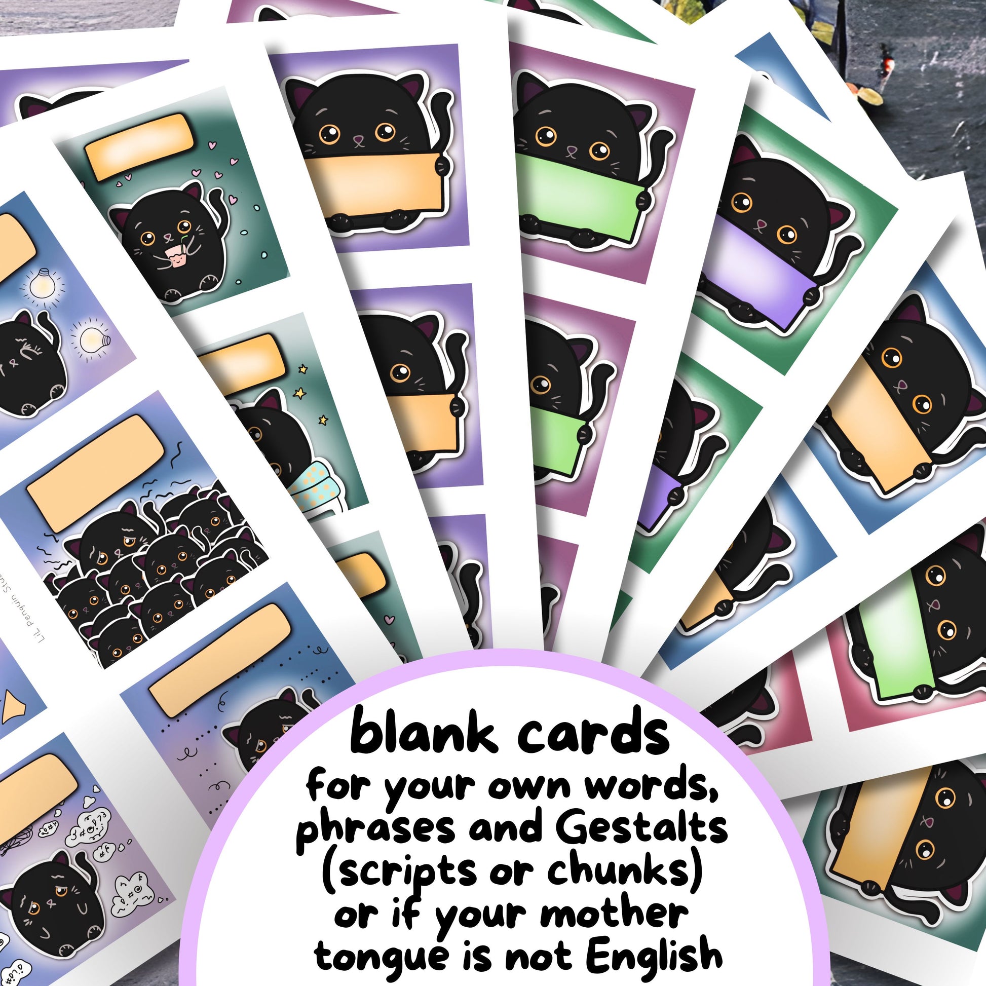 - 8 blank sheets (=48 cards). you can use these to write your own words/ phrases/ Gestalts, etc. You can also use these if your mother tongue is not English.