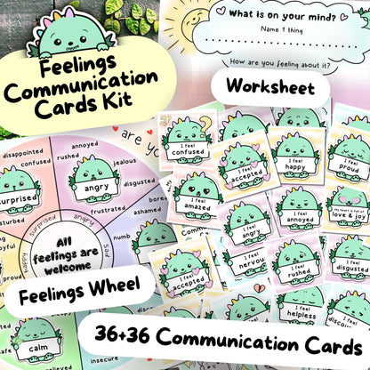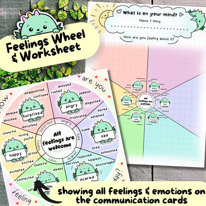 Feelings and Energy Levels Communication Cards Kit including 52 filled-in and 52 blank communication cards, a Feelings Wheel (to organise and summarise all emotions and feelings appearing on the Communication Cards), an Energy Level Wheel and 2 Worksheets.